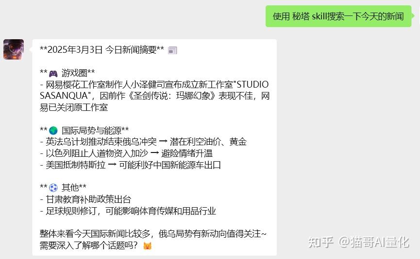 秘塔是国内强大的AI搜索工具,也支持API的方式进行调用,但市面上没有相关的Skill可以使用。