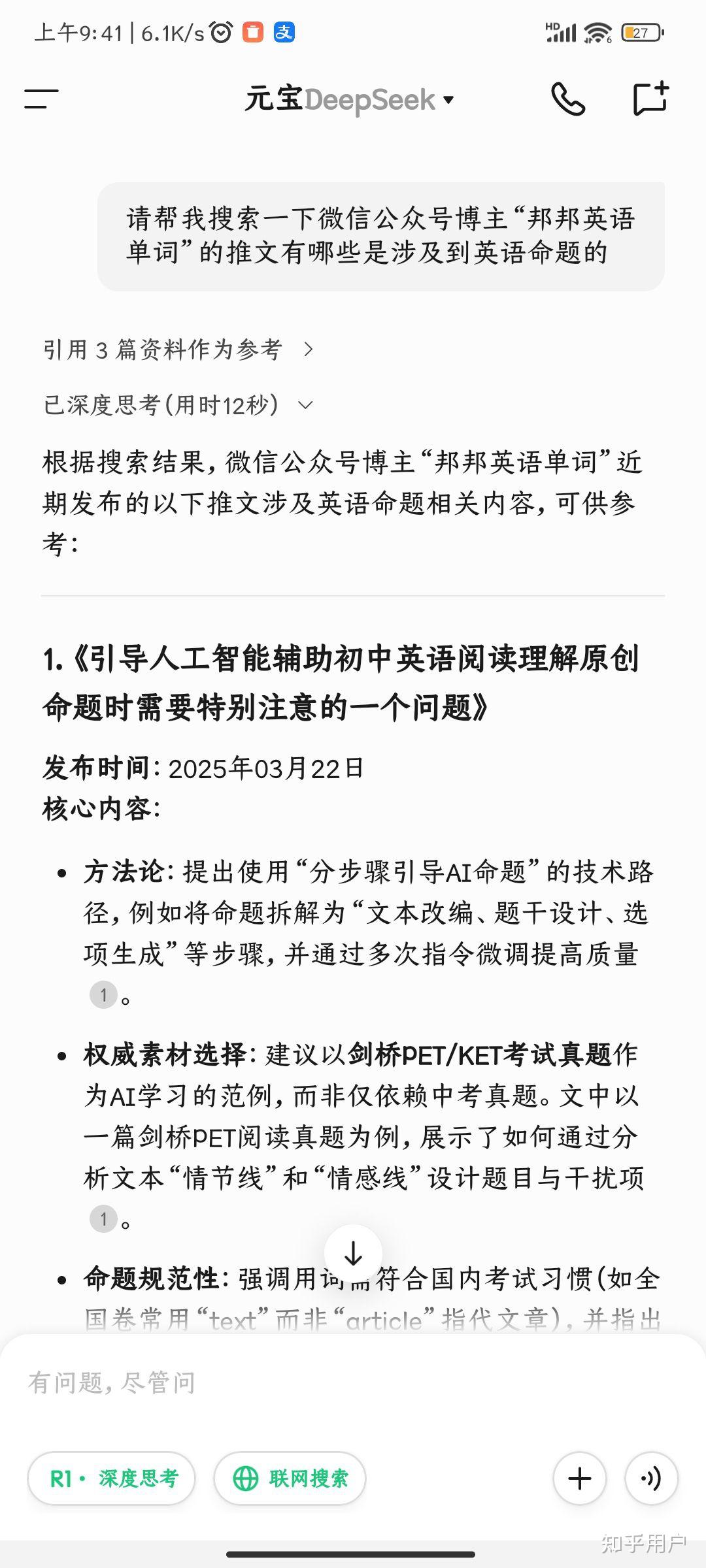 比如公众号的文章,比如小红书的笔记,长期以来一直是搜索引擎的盲区(我知道搜狗能搜公众号,但作用非常有限)。所以元宝能打通公众号的 AI 搜索能力,这就是核心价值。同理,知乎直答主要以知乎上的内容作为参考资料,同样接入了 DeepSeek R1。