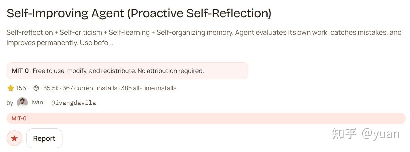 围绕这一点,本文选取了 ClawHub 上由 Iván Davila 提供的技能 Self-Improving Agent(Proactive Self-Reflection) 作为案例。在 ClawHub 与 LLMBase 的介绍里,这个技能的下载量已经稳定排在前列(可参考 ClawHub 技能页 与 LLMBase 介绍)。