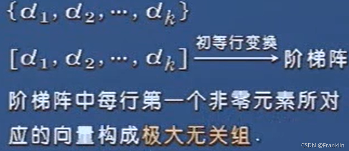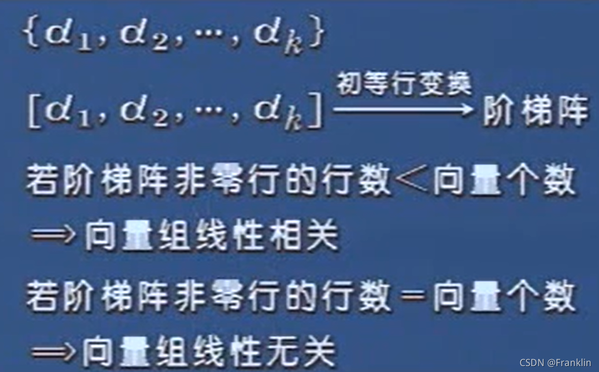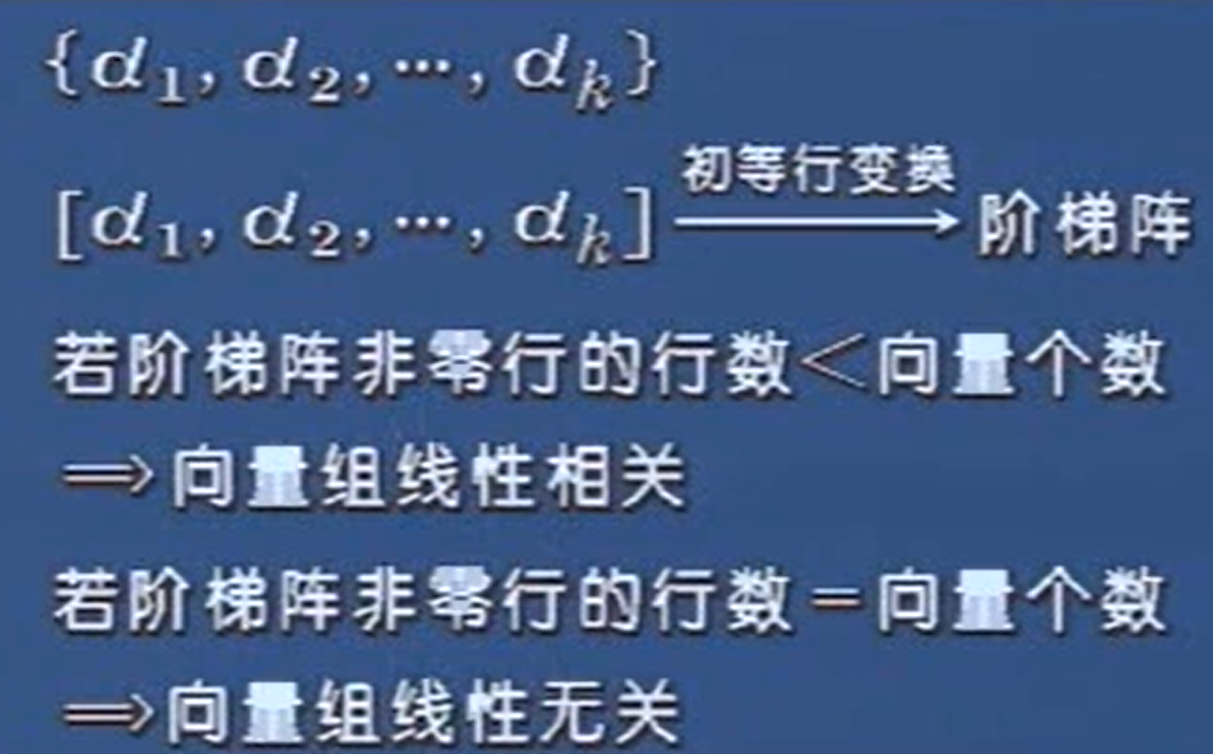 针对一组向量,把他并起来写成一个矩阵。然后,变成阶梯阵。将阶梯阵里面非零行的行数和这组的向量个数进行比较。如果小于,这这组向量是线性相关,否则不相关。