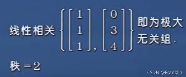 上图,中1,3被圈的位置,分别为第一个和第3个向量,这两个向量组成的向量组,就是极大线性无关组。他的个数是2,那么这个线性相关组的秩就是2 。