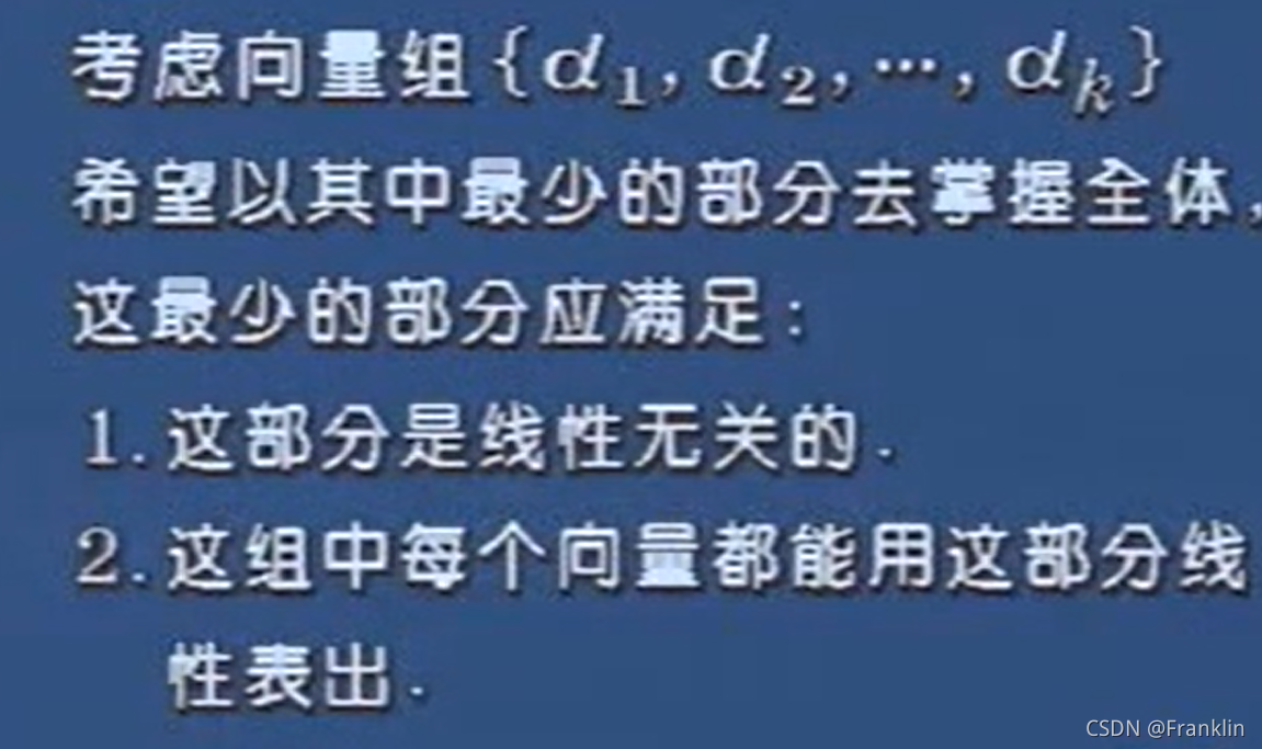 上述,为线性相关性的表述,可以看到,这个4维向量的向量之间是具备线性相关性的。【因为说有点向量都可以用我们刚才选出的两个向量进行线性表述】