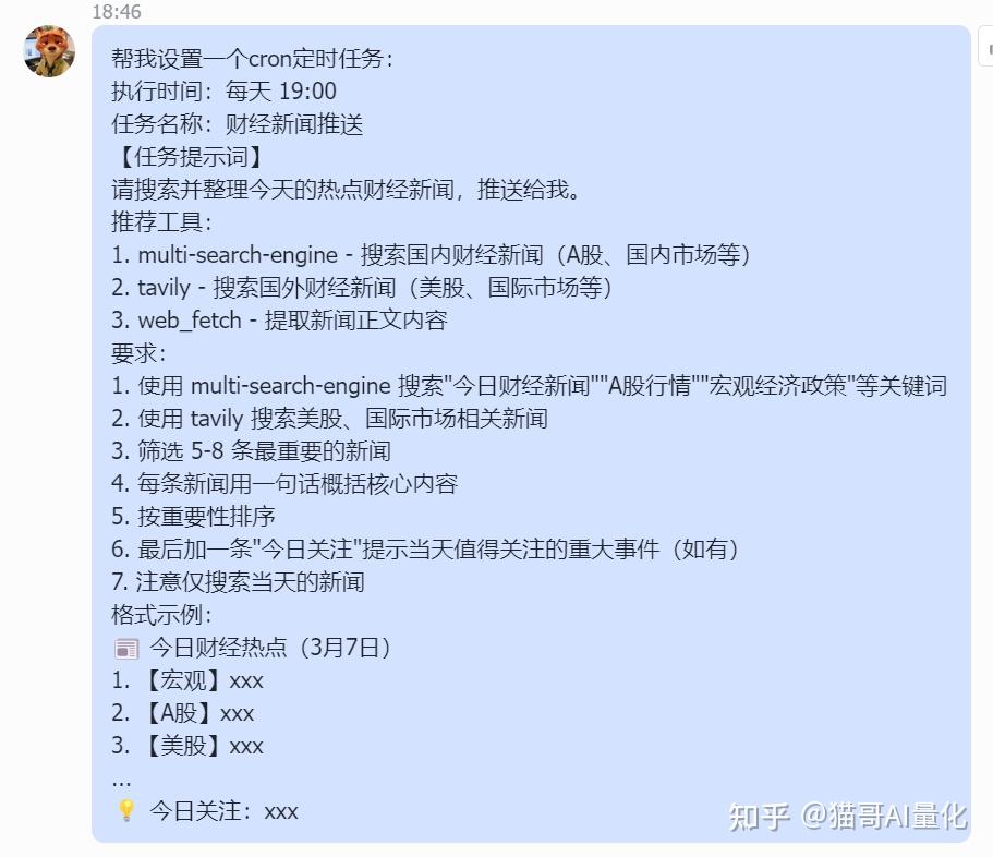 今天继续给大家更新OpenClaw有关的技巧,作为量化博主,猫哥的粉丝群体多与财经相关,最近有朋友问猫哥:能不能让 OpenClaw 每天早上自动推送财经新闻?