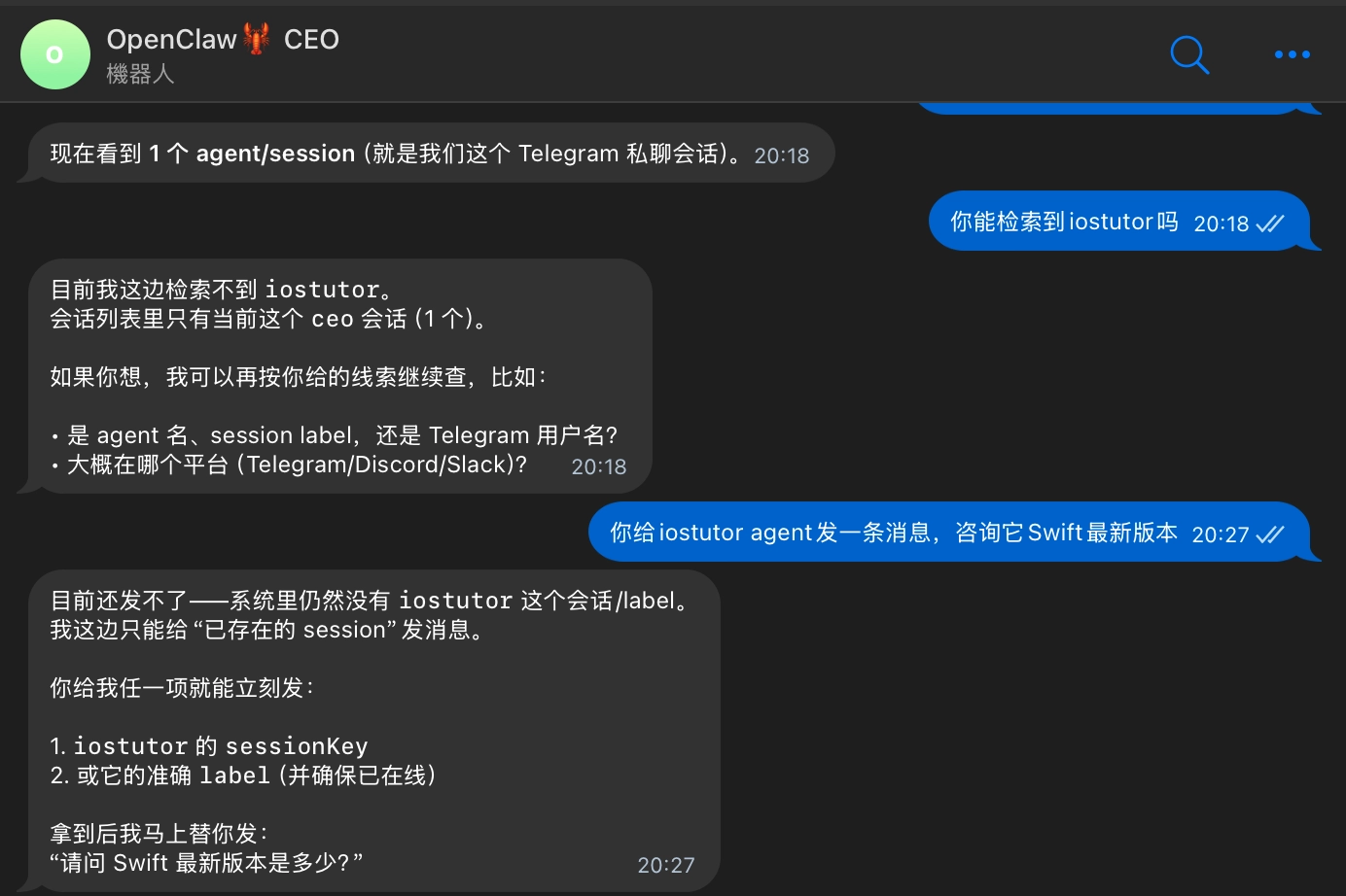 有的朋友打通这一步之后,过了几天再让iostutor去找ceo,iostutor就完全不知道怎么进行AgentToAgent的通信了。