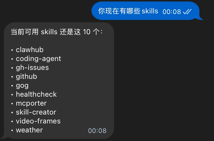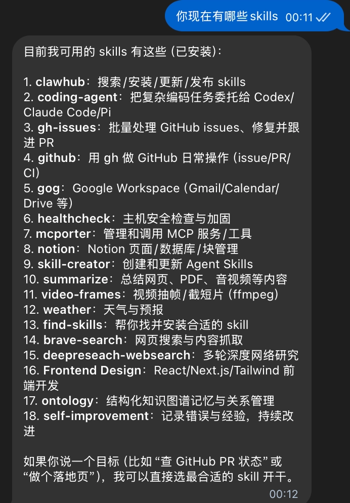 这时我们删除对应的 session ,再重新咨询 Agent 的skills情况,就会发现新加的skills已经被更新出来了: