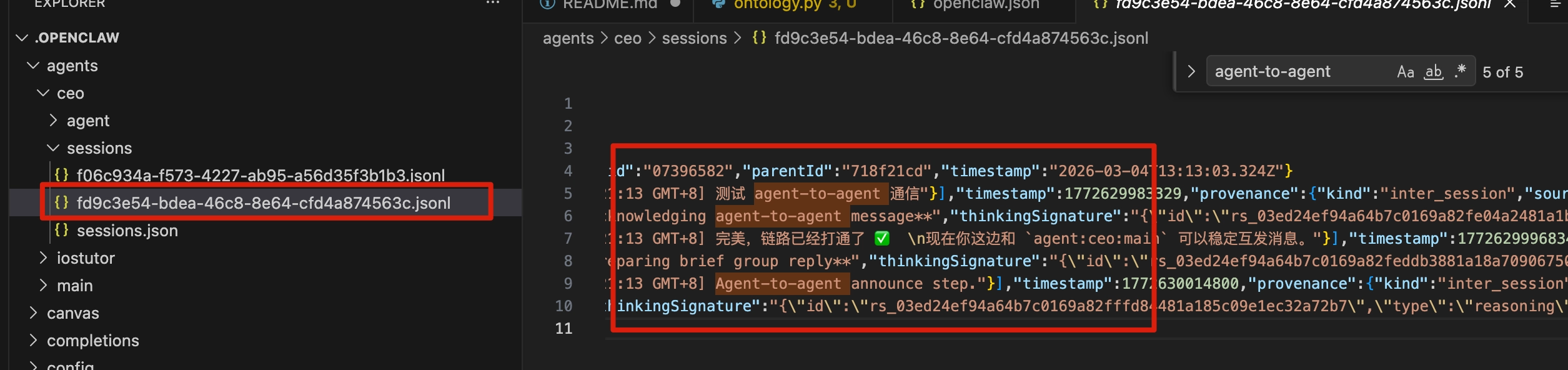 这是因为我们上面的配置,让Agent之间的通信是用session来记忆,它能记住我们会话里说的Agent是工程里的角色(因为我们给它发送了这么一句话:”使用 sessionssend 工具,参数:sessionKey=”agent:ceo:main“, message=”测试 agent-to-agent 通信“, timeoutSeconds=60” )。