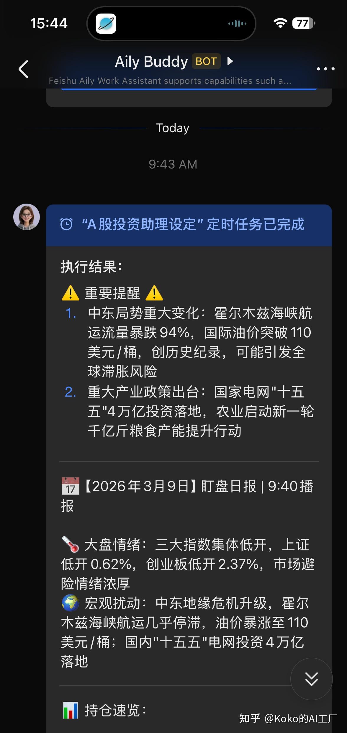 我设置A股持仓监控任务,让 Aily提供每日操作建议。这样可以避免忘记盯盘,及时获取市场动态提醒。同时下载飞书手机端打开通知,就可以在移动端获得信息了,一样方便。