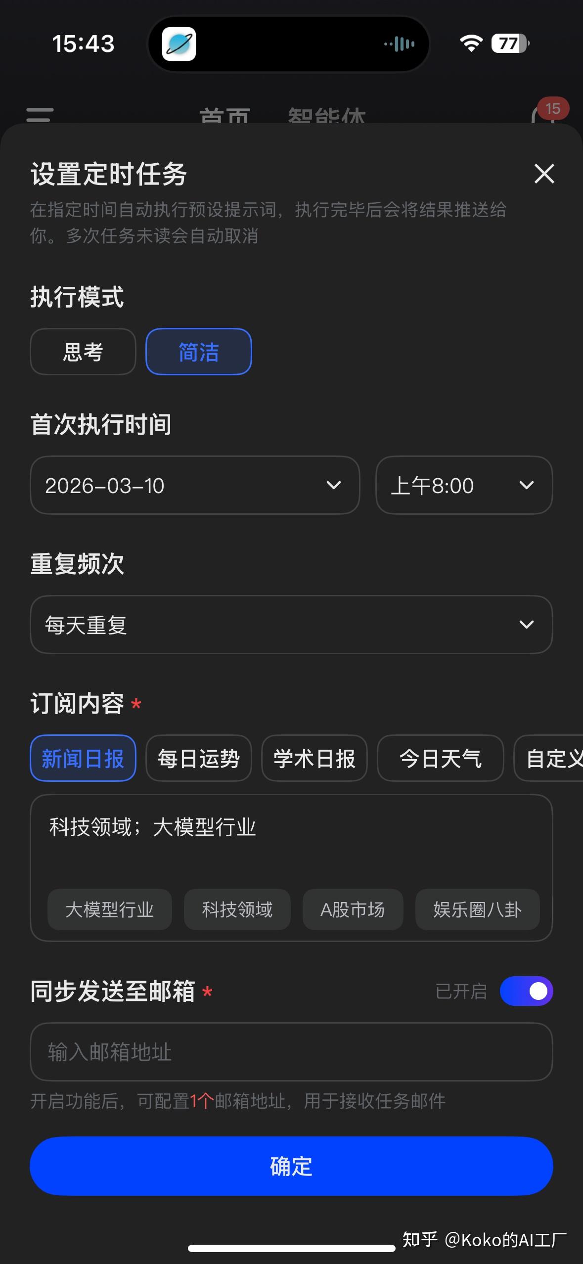 可以设置 AI 资讯的定时推送,每天自动发送到你的账号。通过不同信息源获取更丰富的资讯内容。