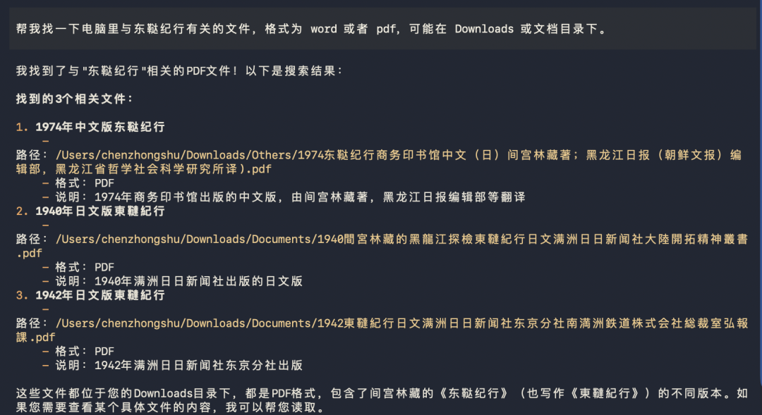 “帮我找一下电脑上《东鞑纪行》有关的文件,格式为 word 或者 pdf,可能在 Downloads 或文档目录下。找到后直接通过 imessage 发送给我。”