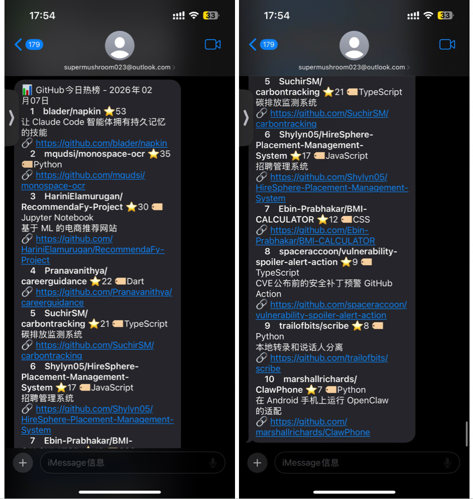 “每天下午17:40查询 github 的今日热榜并将其做成一个中文简报(需附带项目链接),完成后通过 imessage 发送给我。”