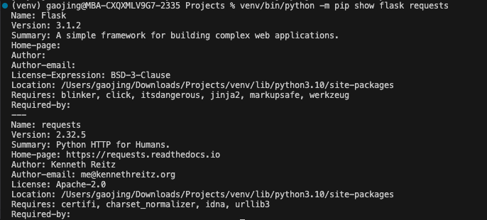 “在 Downloads 目录下创建一个名为 Projects 的文件夹,初始化一个 Python 3.10 的虚拟环境,安装 flask 和 requests 库,然后用 VS Code 打开这个文件夹…”