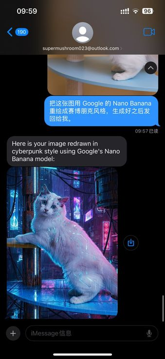 “把这张图用 Google 的 Nano Banana 重绘成赛博朋克风格,生成好之后通过 iMessage 发给我。”
