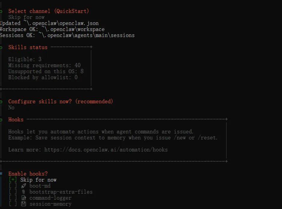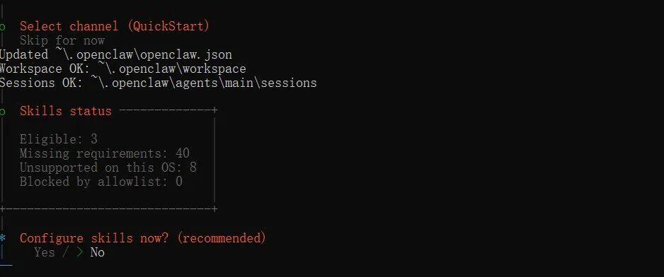 会问你要不要启用预装技能(网页浏览、文件管理、日程管理等)。