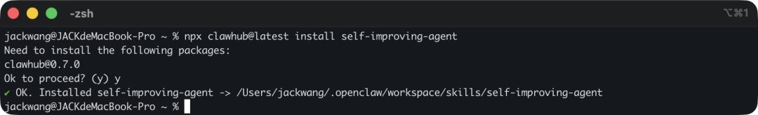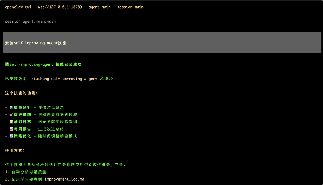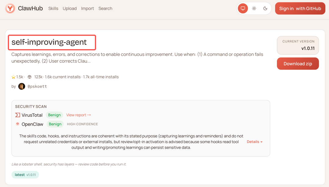 举例:安装ClawHub上最火爆技能:self-improving-agent