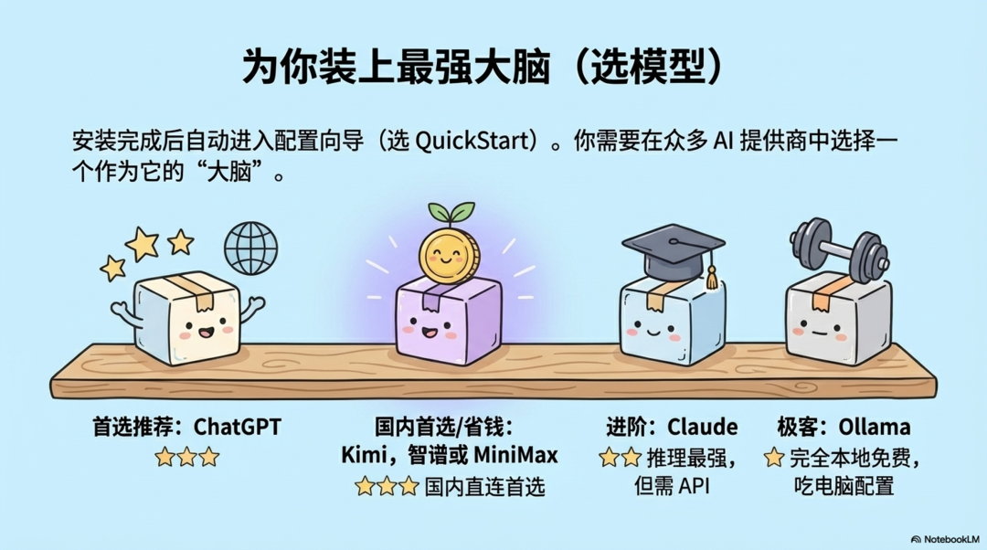 这一步是选"AI 的大脑"用谁家的。会列出几个选项,用键盘上下箭头选择,按回车确认。