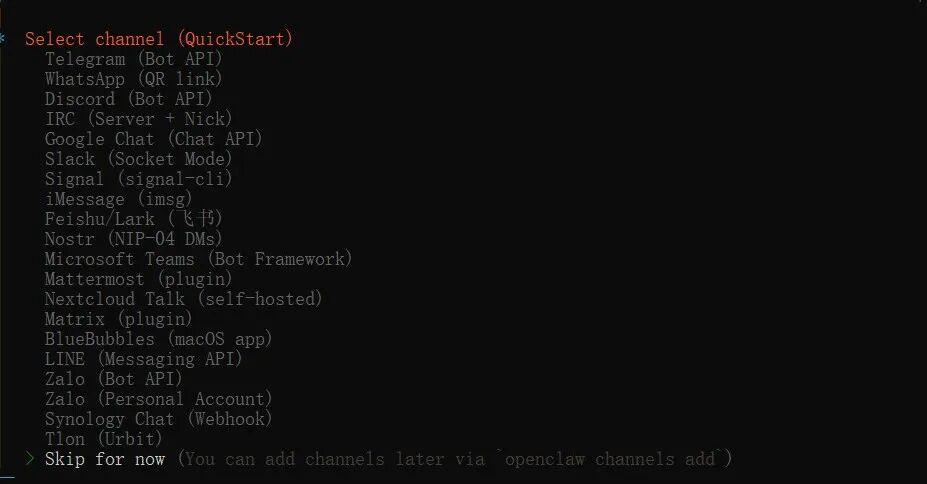 这一步决定你以后怎么跟 OpenClaw 说话。可选: