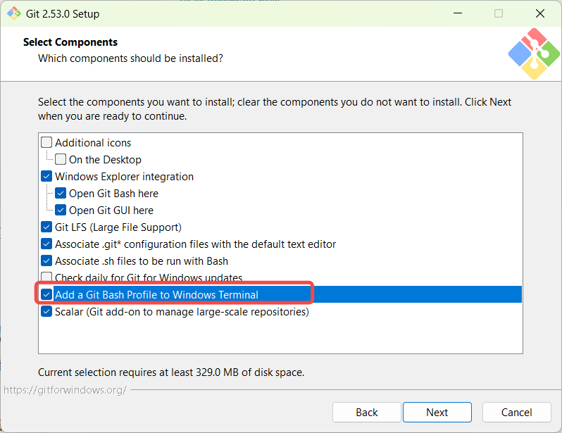 注意其中选择组件一步,勾选“Add a Git Bash Profile to Windows Terminal”,其余点击Next下一步