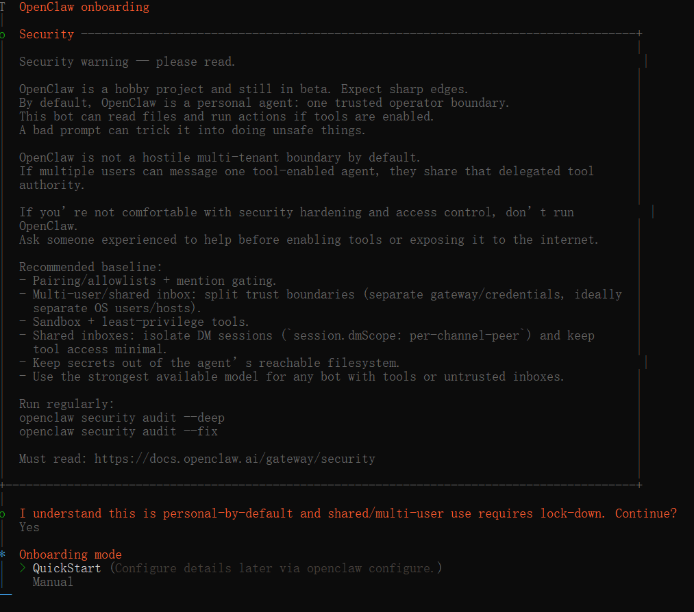 第一个画面会提醒你 OpenClaw 是实验性软件,会访问你的文件和网络,问你是否了解风险。