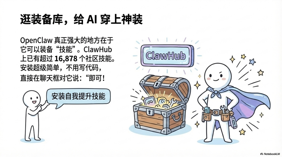 OpenClaw 装好只是第一步。它真正强大的地方在于你可以给它装"技能",让它会做更多事情。