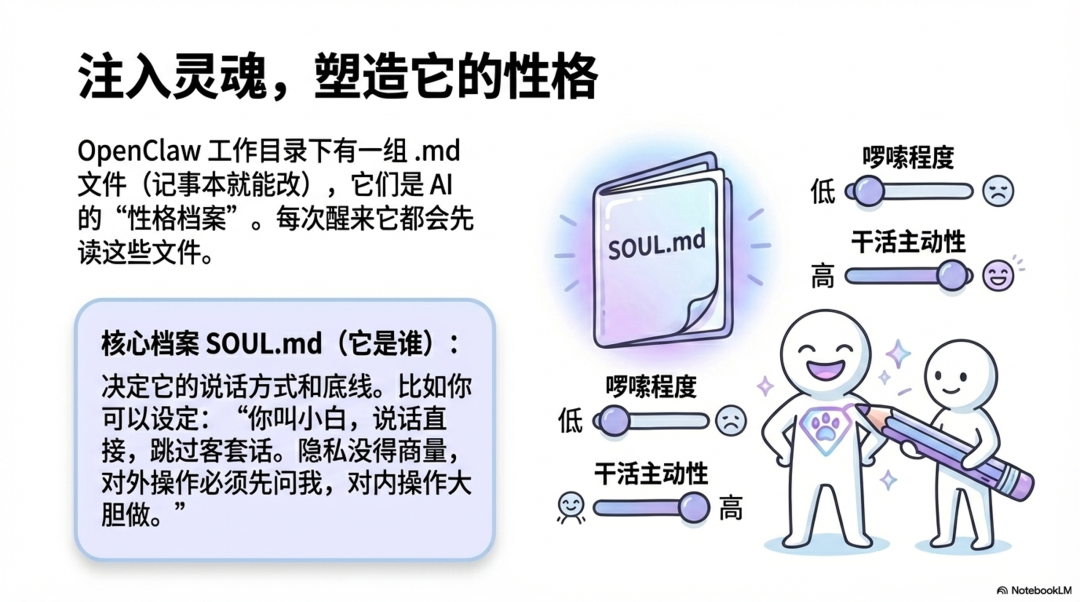 OpenClaw 的工作目录(默认在 ~/.openclaw/workspace/)里有一组 文件,它们就像 AI 的"性格档案"。每次 AI 醒来,第一件事就是读这些文件,搞清楚自己是谁、在帮谁、该怎么做。