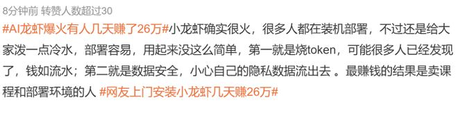 有网友表示,部署容易,用起来没这么简单,第一就是烧token,可能很多人已经发现了,花钱如流水;第二就是数据安全,小心自己的隐私数据流出去 。最赚钱的结果是卖课程和部署环境的人。