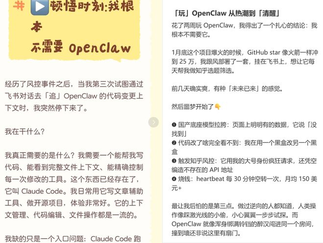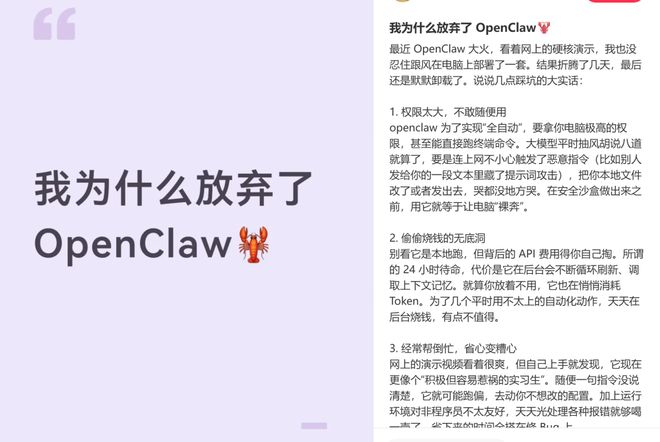 不少网友发布体验心得,openclaw的吐槽点集中在权限太大和烧钱,及任务理解偏差、死循环等BUG上;也有网友认为体验很惊艳。