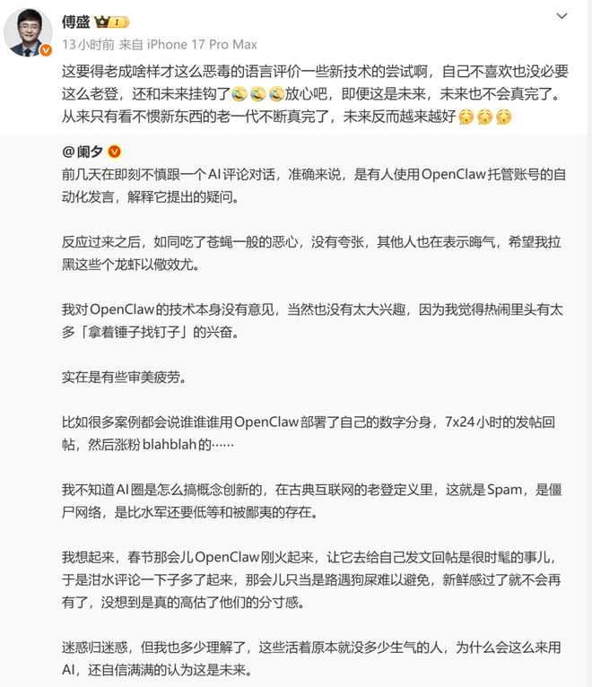 对OpenClaw堪称狂热的傅盛反怼:“这要得老成啥样才这么恶毒的语言评价一些新技术的尝试啊,自己不喜欢也没必要这么老登,还和未来挂钩了。放心吧,即便这是未来,未来也不会真完了。从来只有看不惯新东西的老一代不断真完了,未来反而越来越好。”