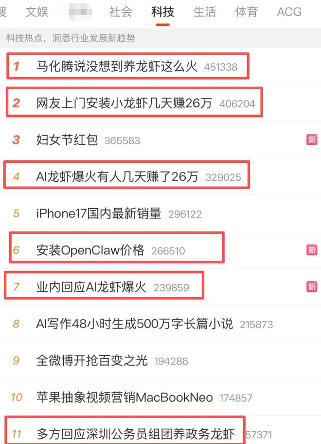 科技热搜榜前11位,有6条话题是关于龙虾的。