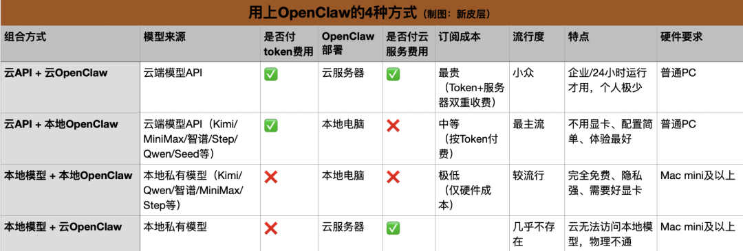 按照Peter Steinberger的构想,最安全且灵活使用OpenClaw的方式是本地部署模型和OpenClaw,然后通过现有即时通讯工具聊天窗口接入。其次是使用以下组合:本地部署OpenClaw + 通过API接口调用云端模型的推理能力 + 现有即时通讯工具。
