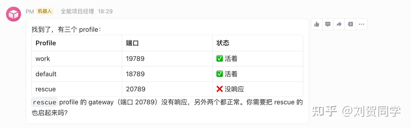 经过一顿折腾,我们现在有三个 Gateway profile 同时跑在一台机器上,互不干扰。飞书里弹出的状态列表直接拉满安全感: