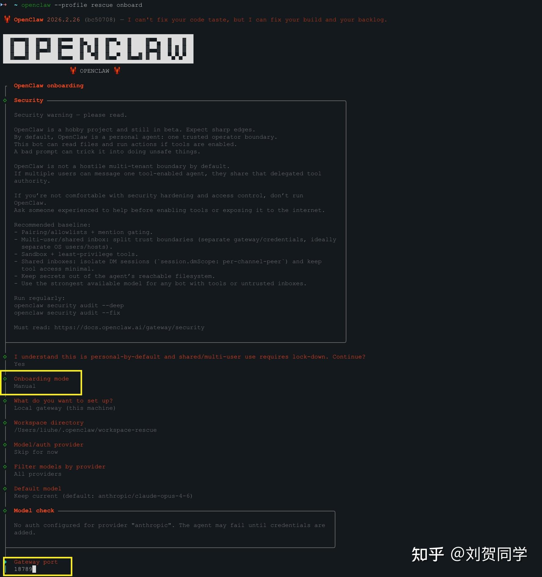⚠️ 引导时选 Manual(不选 Quick),在「网关 / Gateway」步骤端口填 20789(或比主实例至少大 20)。若已有/.openclaw-rescue/openclaw.json,只需保证gateway.port: 20789即可跳过 onboard。