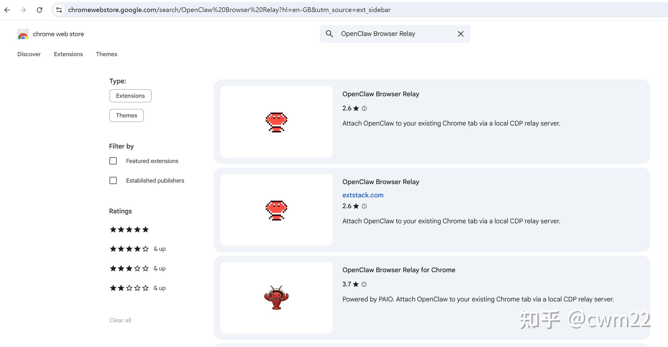 点击图1中左侧的Chrome Web Store,点开后搜索OpenClaw Brower Relay,如图2所示。