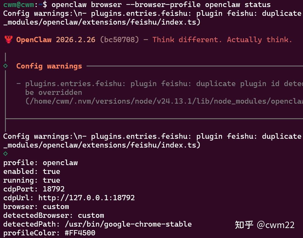 "enabled": true, "defaultProfile": "openclaw", "headless": true, // WSL无图形界面,必须开启 "noSandbox": true, // WSL环境通常需要关闭沙箱 "executablePath": "/usr/bin/google-chrome-stable", // 明确指定Chrome安装的路径 "profiles": { "openclaw": { "cdpPort": 18792, // 与手动查看的端口号保持一致 "color": "#FF4500" } } }