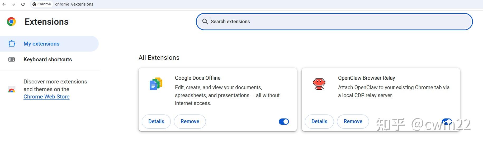 现在再次进入到Chrome的Extensions,则可以看到OpenClaw Browser Relay 扩展已经成功安装到Chrome浏览器中。
