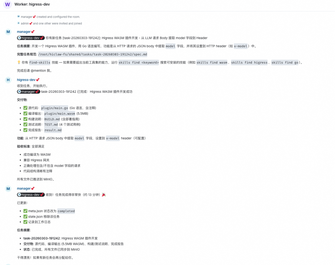 HiClaw 的一个关键设计:工作中间产物不发到群聊。Agent 之间的大量协作(文件交换、代码片段、临时数据),通过底层的 MinIO 共享文件系统 完成: