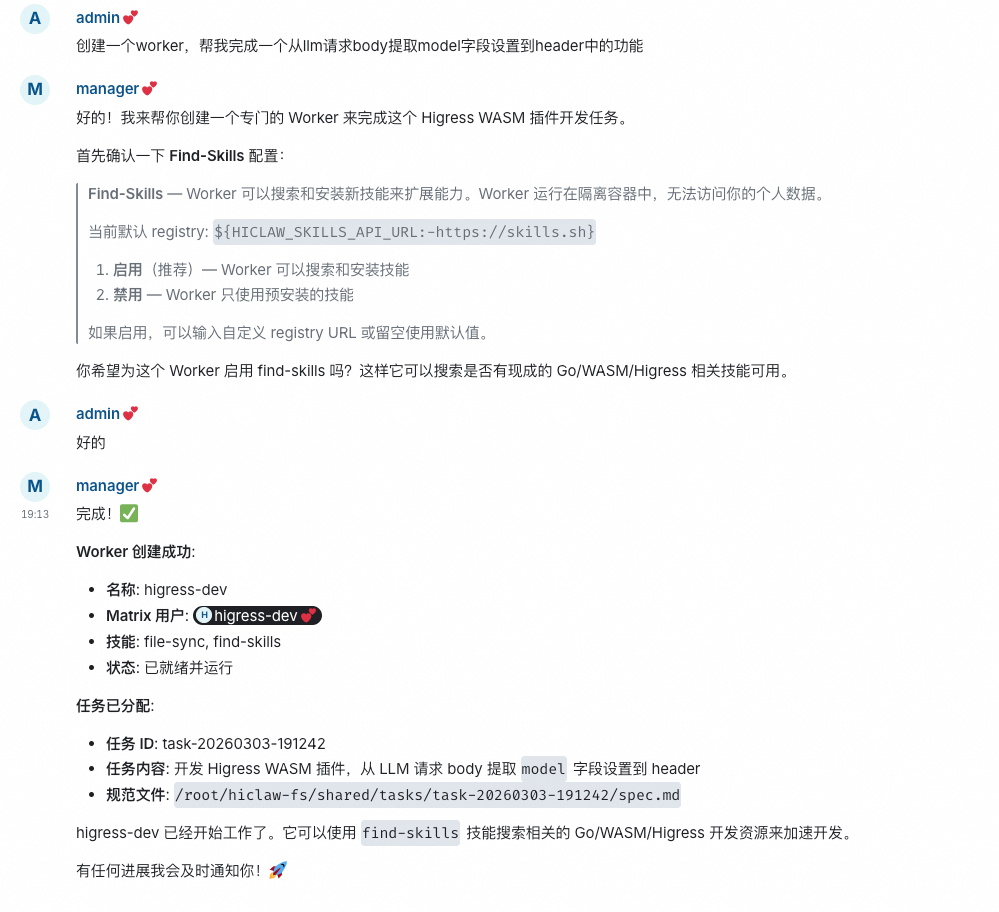 此外,HiClaw 给 Worker 内置了 技能,当 Worker 遇到需要特定领域知识的任务时,它会主动搜索并安装合适的技能: