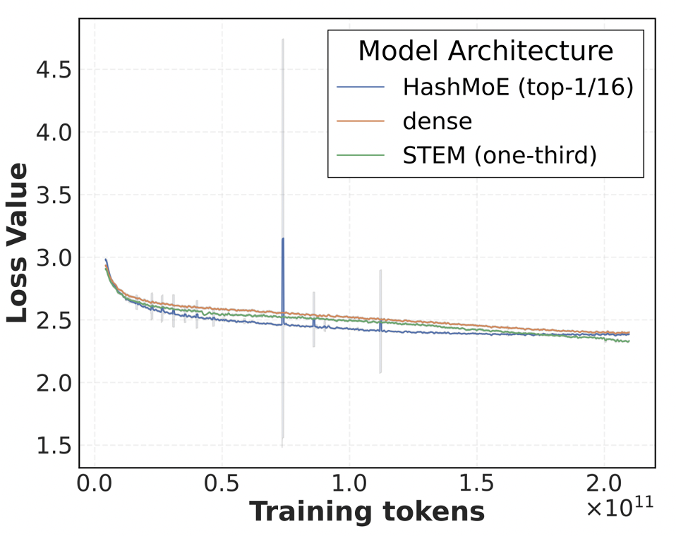 与 MoE 等依赖运行时路由的方案不同,STEM 属于一种静态稀疏结构:每个 token 在每一层所访问的 embedding 是确定的,不涉及负载均衡或 all-to-all 通信。这种设计避免了 MoE 中常见的 load skew 与 loss spike 问题。