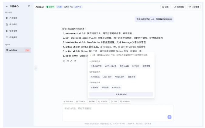 在技术生态方面,ArkClaw 深度整合了“火山方舟”模型平台,原生协同 Doubao-Seed-2.0系列、Kimi2.5、MiniMax2.5及 GLM 等主流大模型,尤其在配合 Doubao-Seed2.0Pro 执行复杂任务时表现出显著的逻辑一致性。