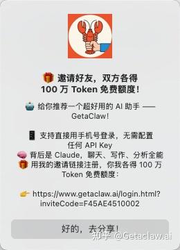 如果你也一直听说OpenClaw、一直想试、但被安装门槛拦住的话,getaclaw.ai 这个入口值得试一试。百万token的免费额度够你把龙虾的各种能力全部体验一遍,装好连上飞书,让它帮你跑几天,你会自己知道答案的。