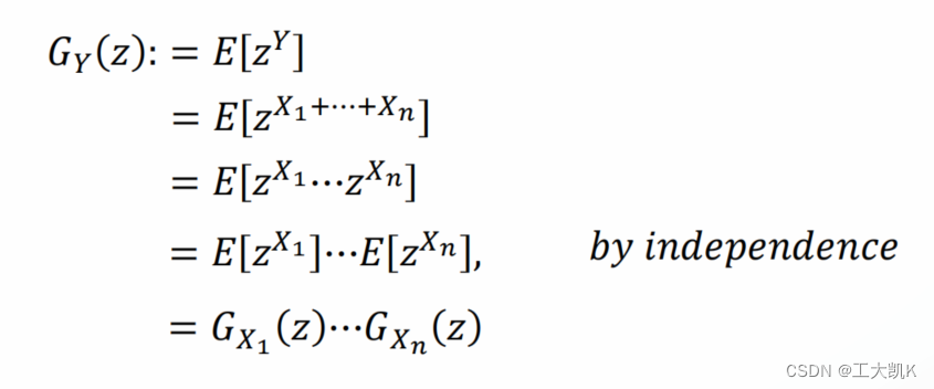 1: 独立随机变量之和的概率生成函数pgf 等于 各个独立随机变量概率生成函数pgf 的 乘积 。(因分解特性factorization property)