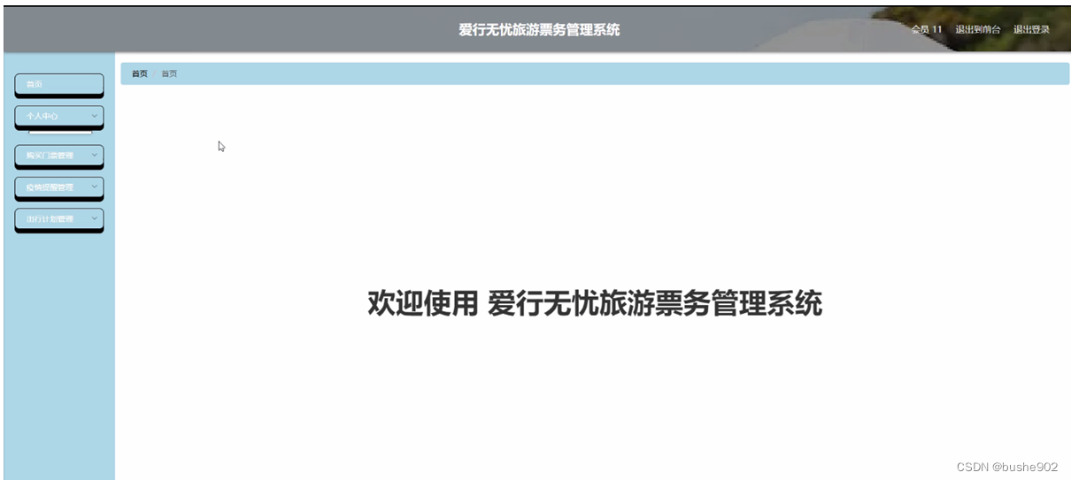 管理员登录进入爱行无忧旅游票务管理系统可以查看首页、个人中心、会员管理、景点信息管理、购买门票管理、疫情提醒管理、系统管理等信息进行详细操作,如图4-10所示。