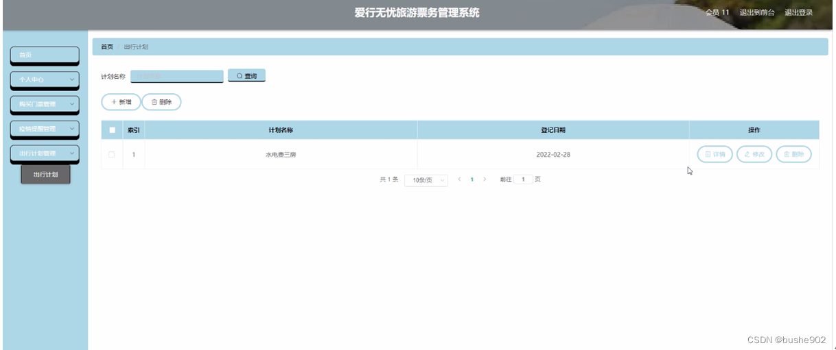 出行计划管理,会员可在出行计划管理页面通过输入计划名称进行查询、新增、修改或删除等操作,如图4-8所示。