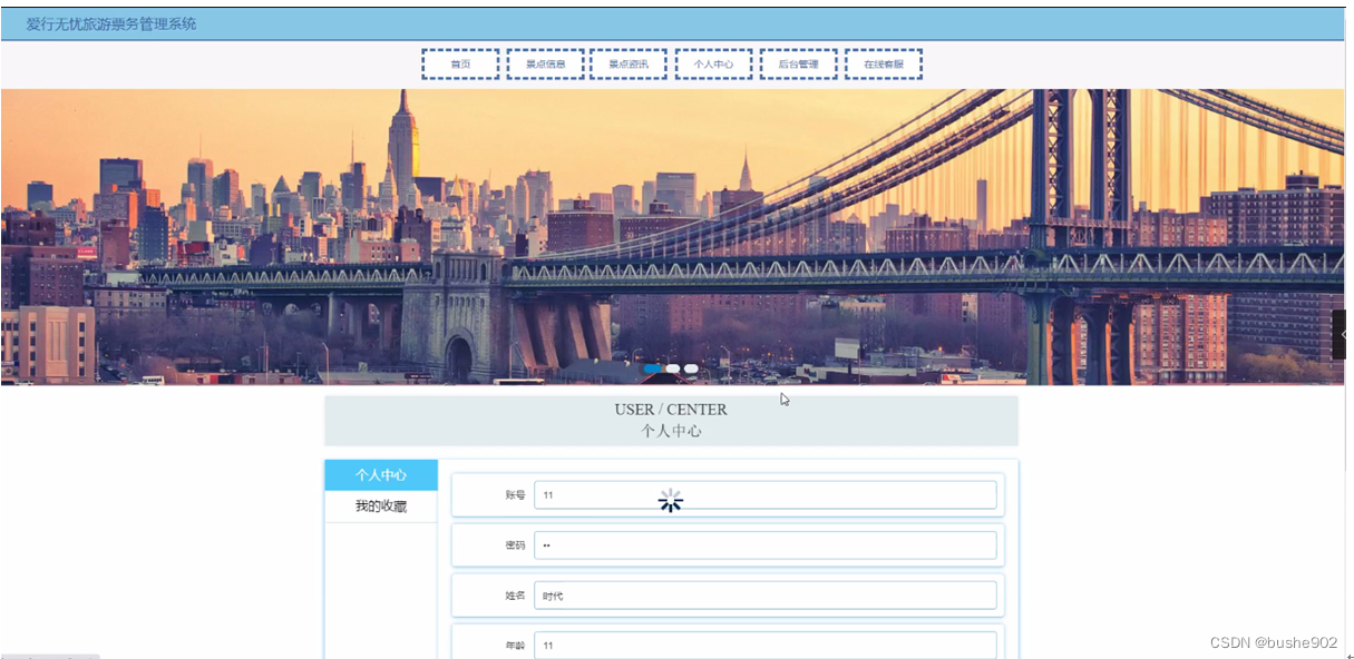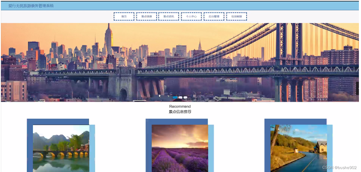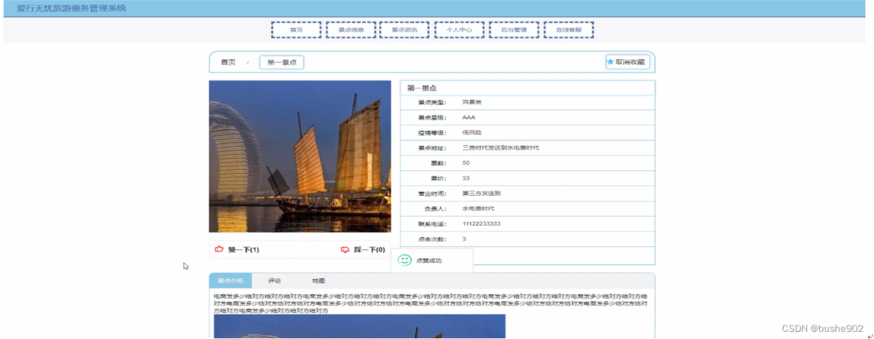 前台功能:用户进入系统可以实现首页、景点信息、景点资讯、个人中心、后台管理、在线客服等进行操作;