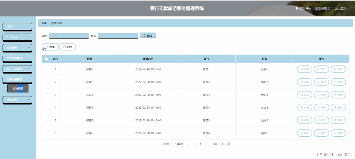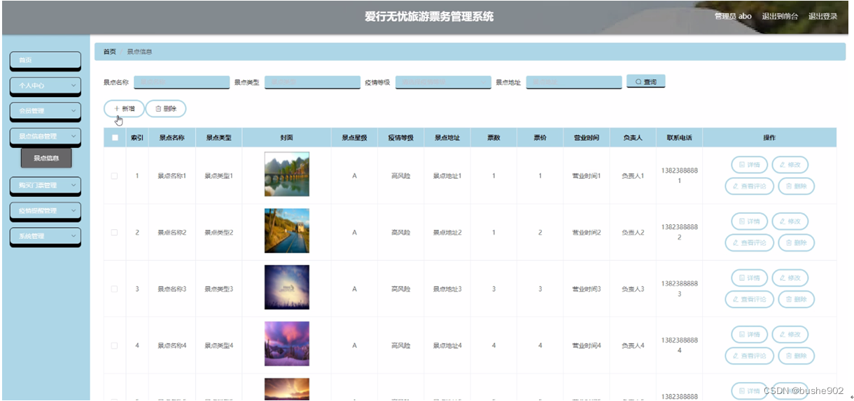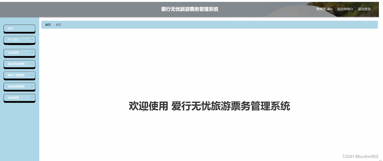 后台主要是管理员,管理员功能包括首页、个人中心、会员管理、景点信息管理、购买门票管理、疫情提醒管理、系统管理等;