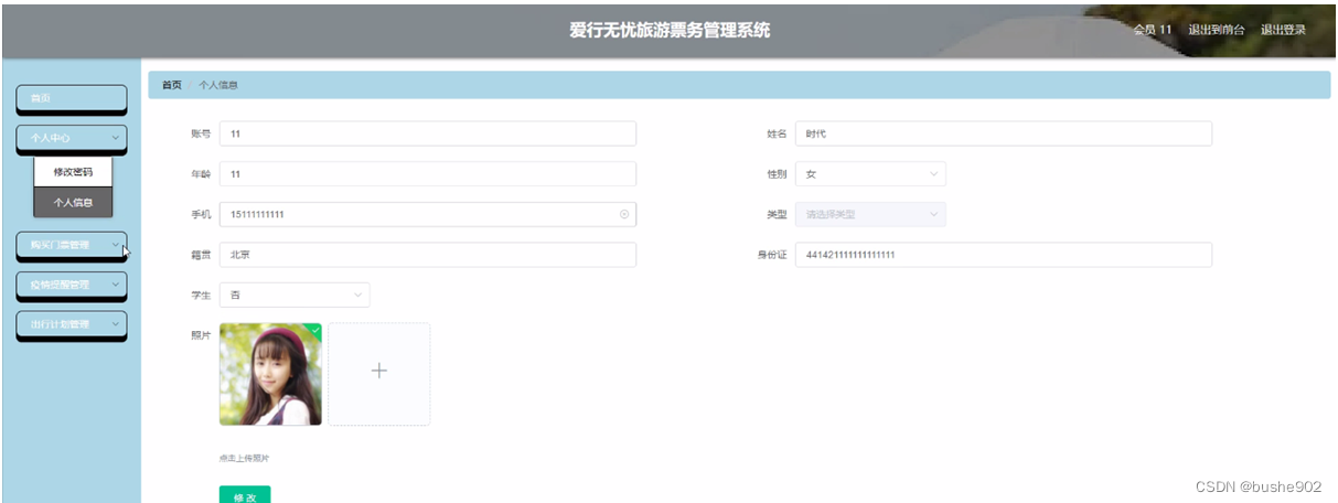 个人中心,会员看这个人中心页面进行密码修改或通过输入账号、姓名、年龄、性别、手机、类型、籍贯、身份证、是否学生、照片等内容进行信息修改等操作,如图4-7所示。