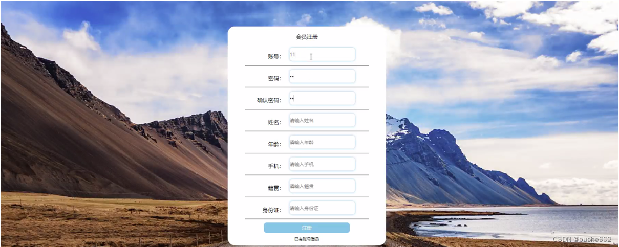会员注册,会员通过输入账号、密码、姓名、年龄、手机、籍贯、身份证等内容进行注册,如图4-4所示。