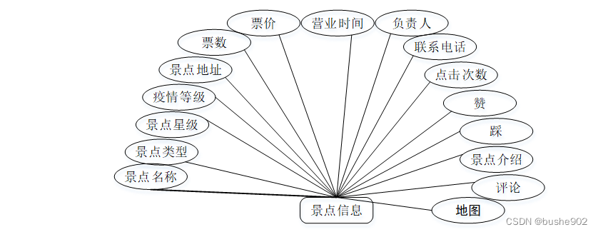 景点信息,用户在景点信息页面可查看景点名称、景点类型、景点星级、疫情等级、景点地址、票数、票价、营业时间、负责人、联系电话、点击次数、赞、踩、景点介绍、评论、地图等内容,还可进行收藏等操作,如图4-2所