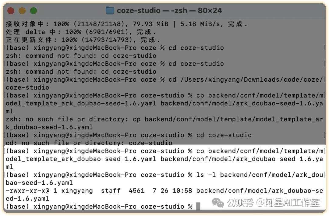 # 启动服务,换成你自己的路径,比如我的是 cd /Users/xingyang/Downloads/code/coze/coze-studio/docker#然后分别键入 cd docker cp .env.example .env docker compose –profile ‘*’ up -d
