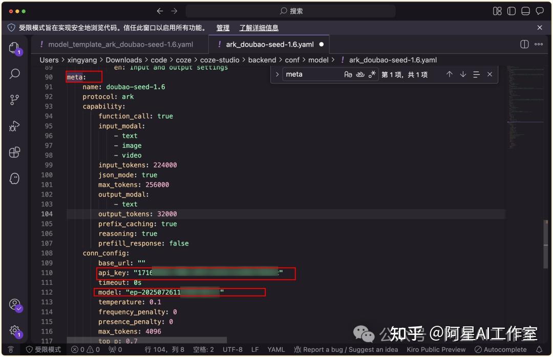 b、注意,打开你复制后的ark_doubao-seed-1.6.yaml,注意!接下来用的是这个复制后的文件,不是模板里的文件。