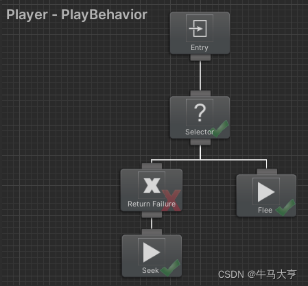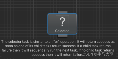 第二个,Selector选择,有点类似于编程语言的||或运算,一真即真,只要有一个子任务返回为执行成功Success整个行为树将判定为Success立刻停止,若没有子任务成功则返回Failure。